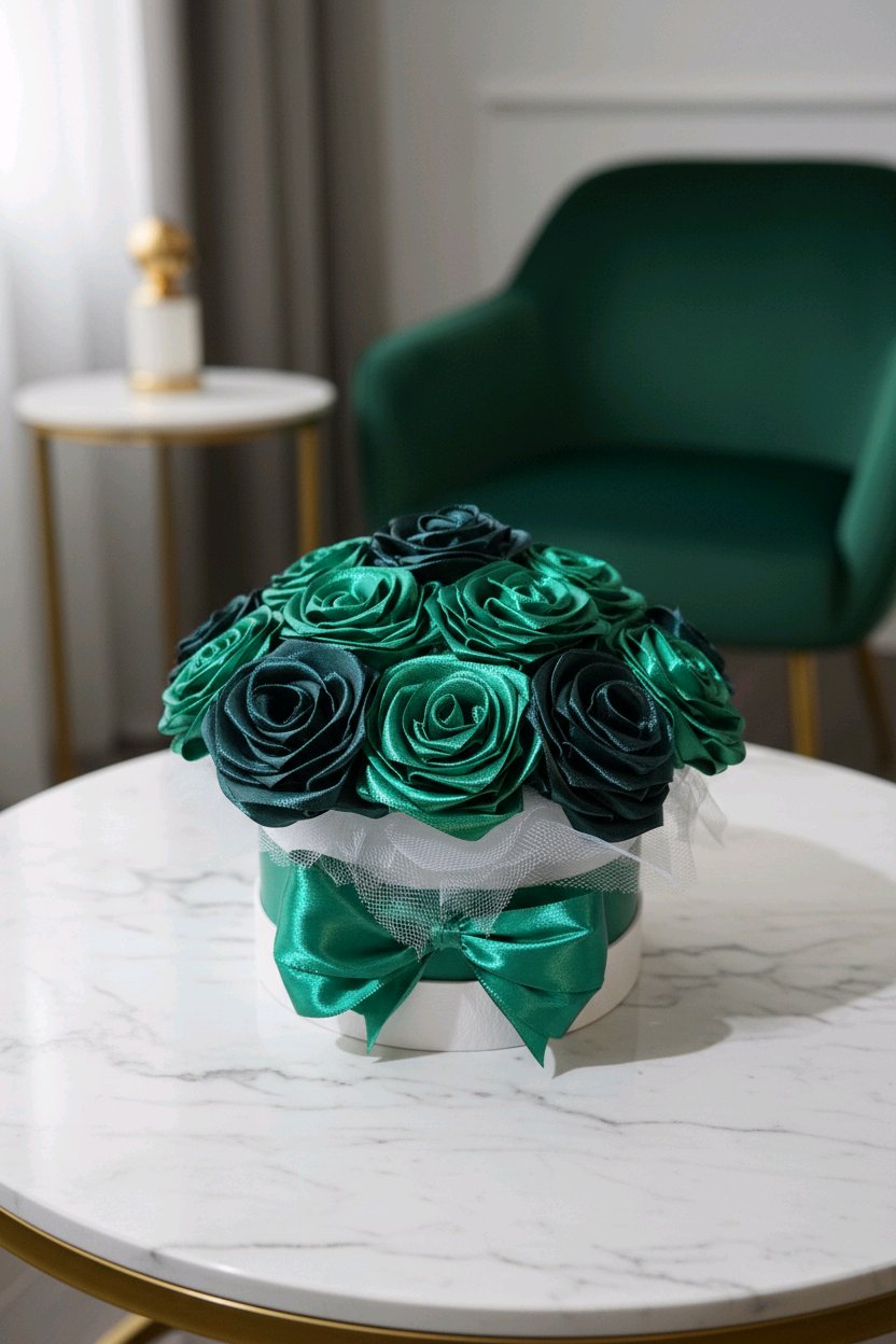 Käsintehty satiiniruusubuketti lahjaboxissa
