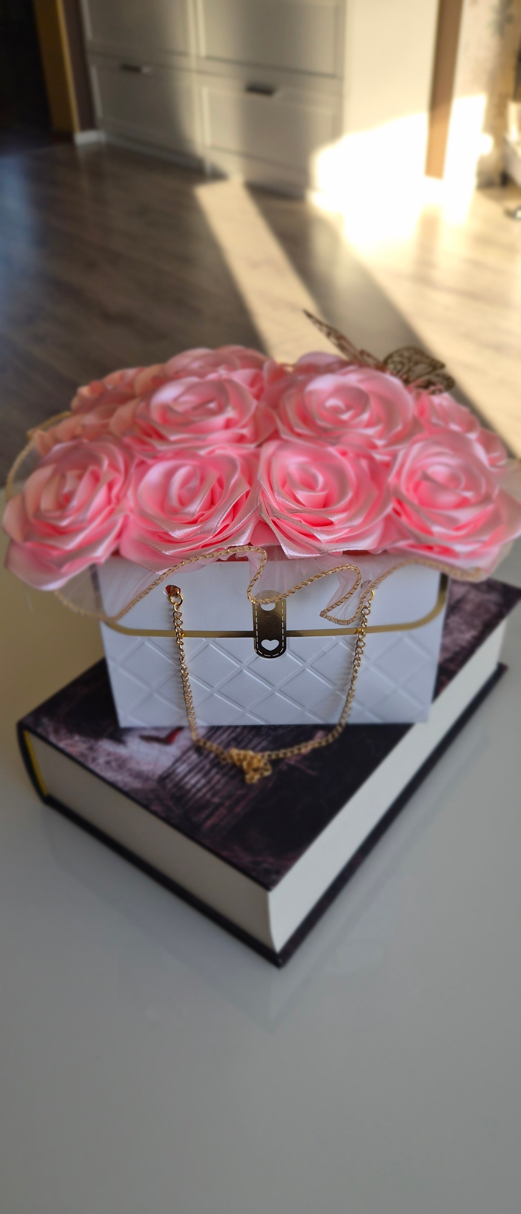 Laukun muotoilu muistuttaa pientä käsilaukkua, mikä tekee siitä erityisen – se ei ole pelkkä pakkaus, vaan osa lahjaa. Tukeva paperirakenne pitää muotonsa, ja koristeellinen ketju viimeistelee elegantin kokonaisuuden.