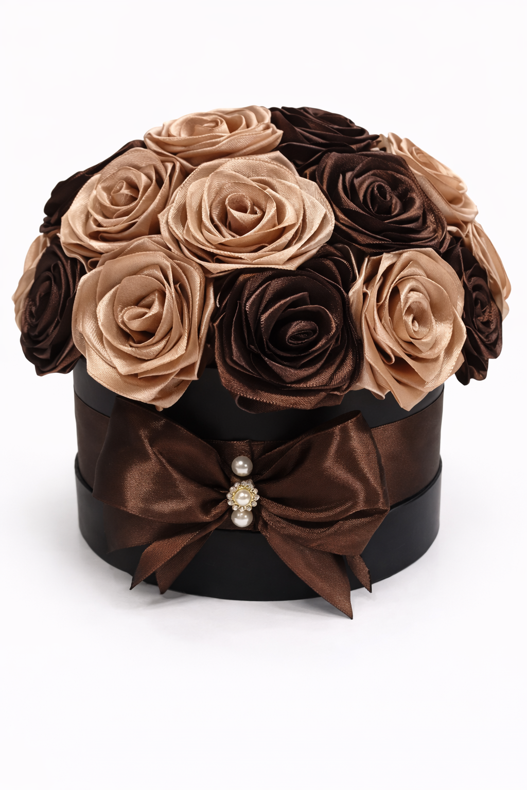 Elegantti käsintehty ruusurasia, jossa yhdistyvät ajaton tyyli ja ylellinen viimeistely. Pehmeät satiiniruusut on aseteltu huolellisesti kauniiksi kokonaisuudeksi mattamustan rasian päälle. Suklaan ja samppanjan sävyt luovat harmonisen ja tyylikkään ilmeen, joka sopii täydellisesti lahjaksi erityisiin hetkiin.